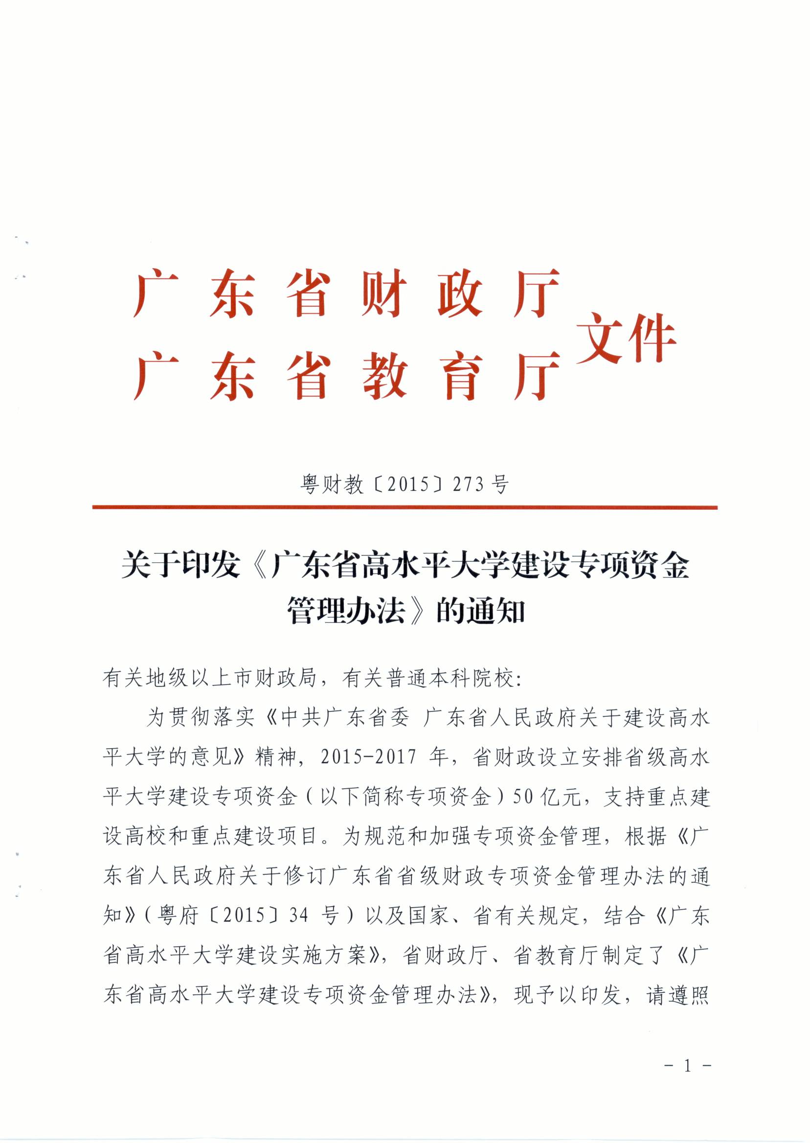 关于印发《广东省高水平大学建设专项资金管理办法》的通知