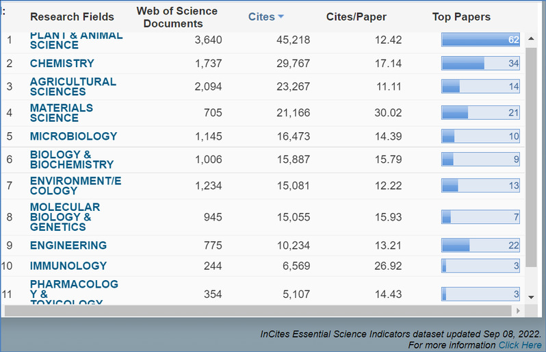 2022年9月8日,科睿唯安发布了ESI学科最新数据,我校新增分子生物学与遗传学进入ESI全球前1%。目前,我校进入全球前1%的ESI学科已达11个,分别是:植物学与动物学、化学、农业科学、材料科学、微生物学、生物学与生物化学、环境科学与生态学、分子生物学与遗传学、工程学、免疫学、药理学与毒理学(依被引次数排序)。植物学与动物学继续保持全球前1‰。